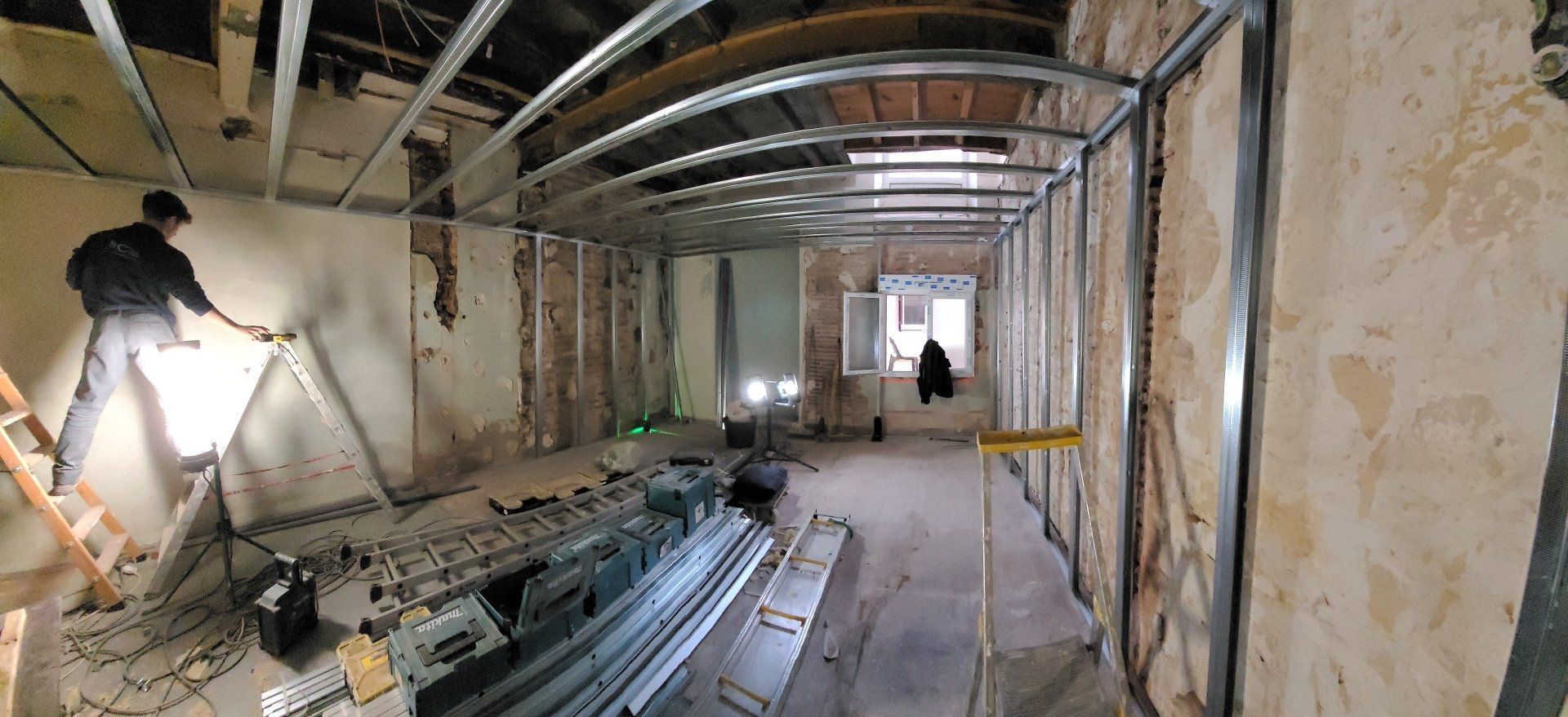 L’ossature métallique est constituée de rails et de montants en acier galvanisé. Les rails sont fixés au sol et au plafond, tandis que les montants sont fixés aux rails verticalement. Les plaques de plâtre sont ensuite vissées sur l’ossature métallique.